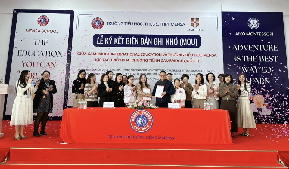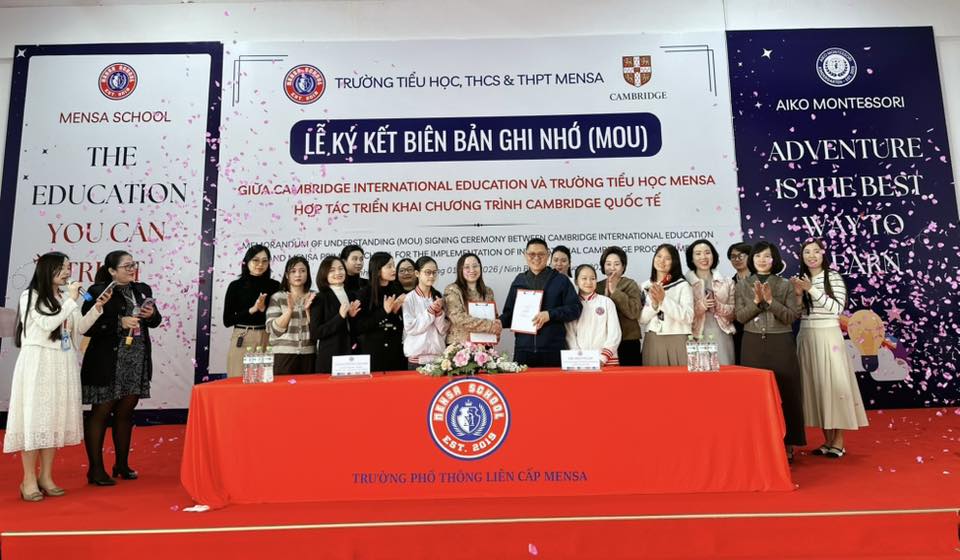 🎉Sáng nay, tại Trường Tiểu học, THCS & THPT Mensa đã long trọng diễn ra Lễ ký kết Biên bản ghi nhớ hợp tác (MOU) giữa Cambridge International Education với Trường Tiểu học Mensa – sự kiện mang ý nghĩa đặc biệt, đánh dấu bước tiến chiến lược trong hành trình chuẩn hóa và hội nhập giáo dục quốc tế của nhà trường.