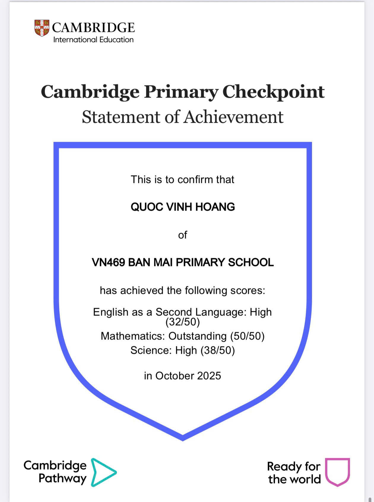 🧩Cambridge Checkpoint Primary là hệ thống đánh giá chuẩn quốc tế, ghi nhận mức độ hoàn thành chương trình Cambridge bậc Tiểu học và là bước đệm quan trọng cho lộ trình học tập tiếp theo.