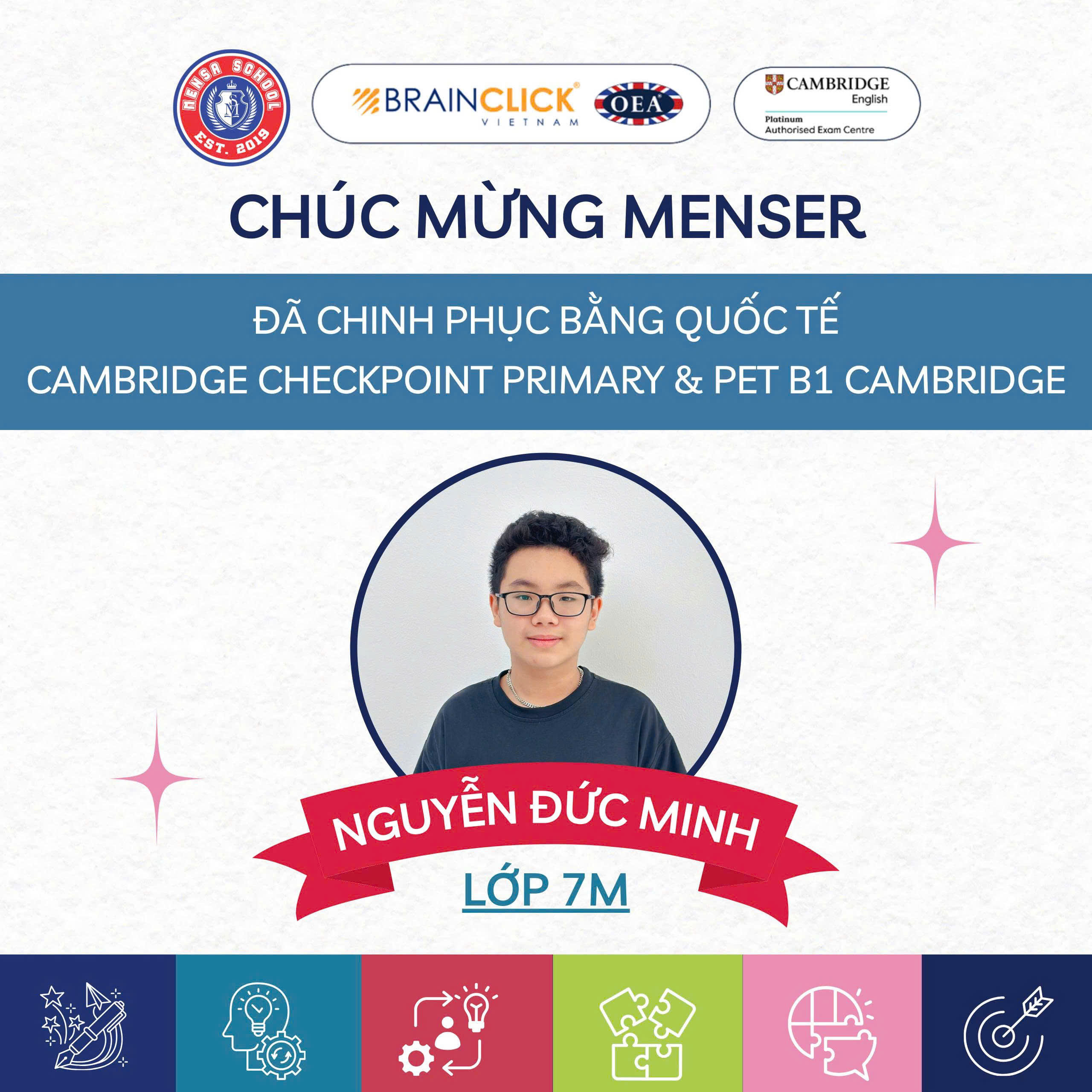 Trường Tiểu học, THCS & THPT Mensa trân trọng vinh danh các em học sinh lớp 6, 7 đã xuất sắc giành được hai cột mốc đánh giá tiếng Anh quốc tế quan trọng của Cambridge:
