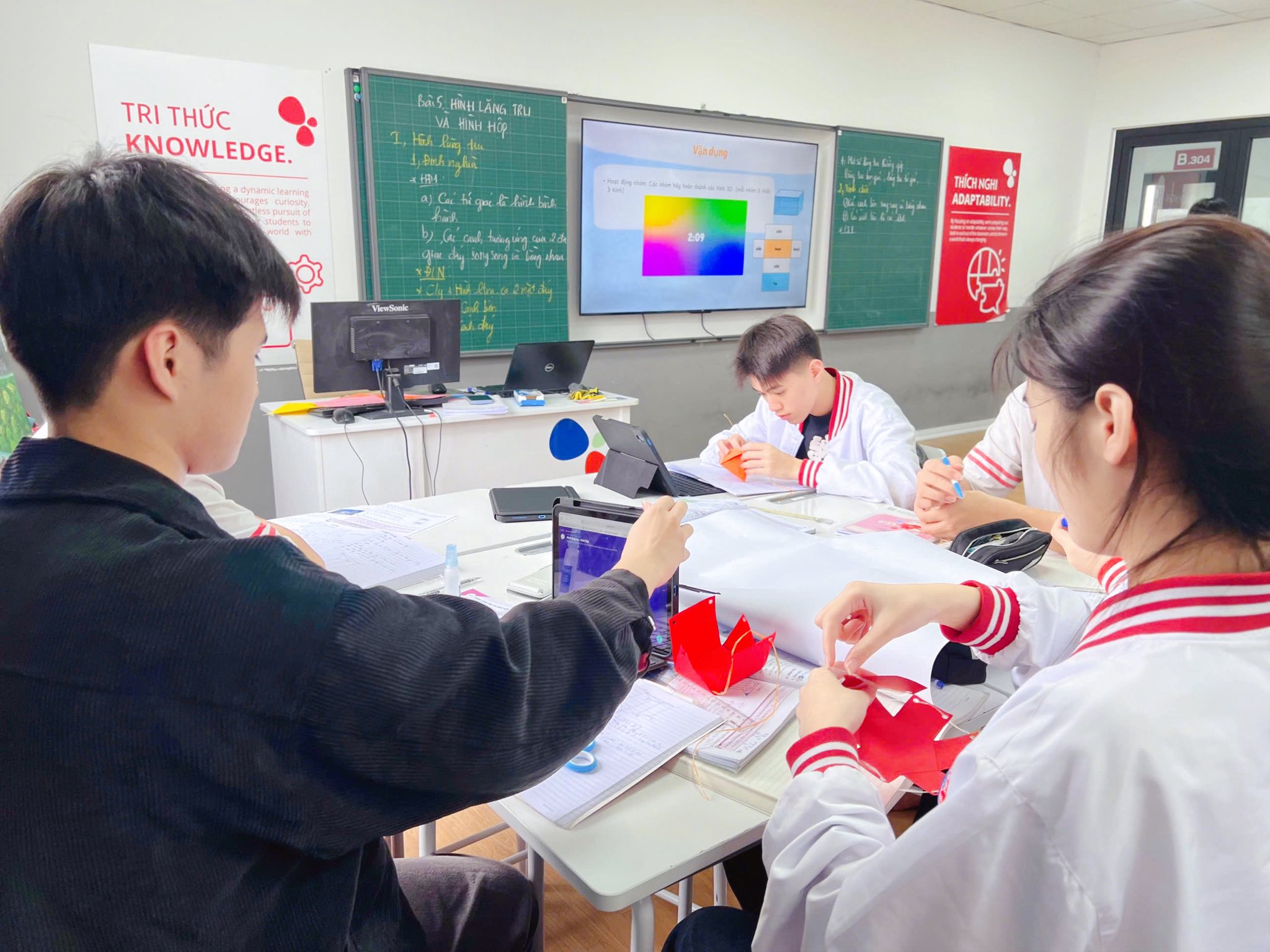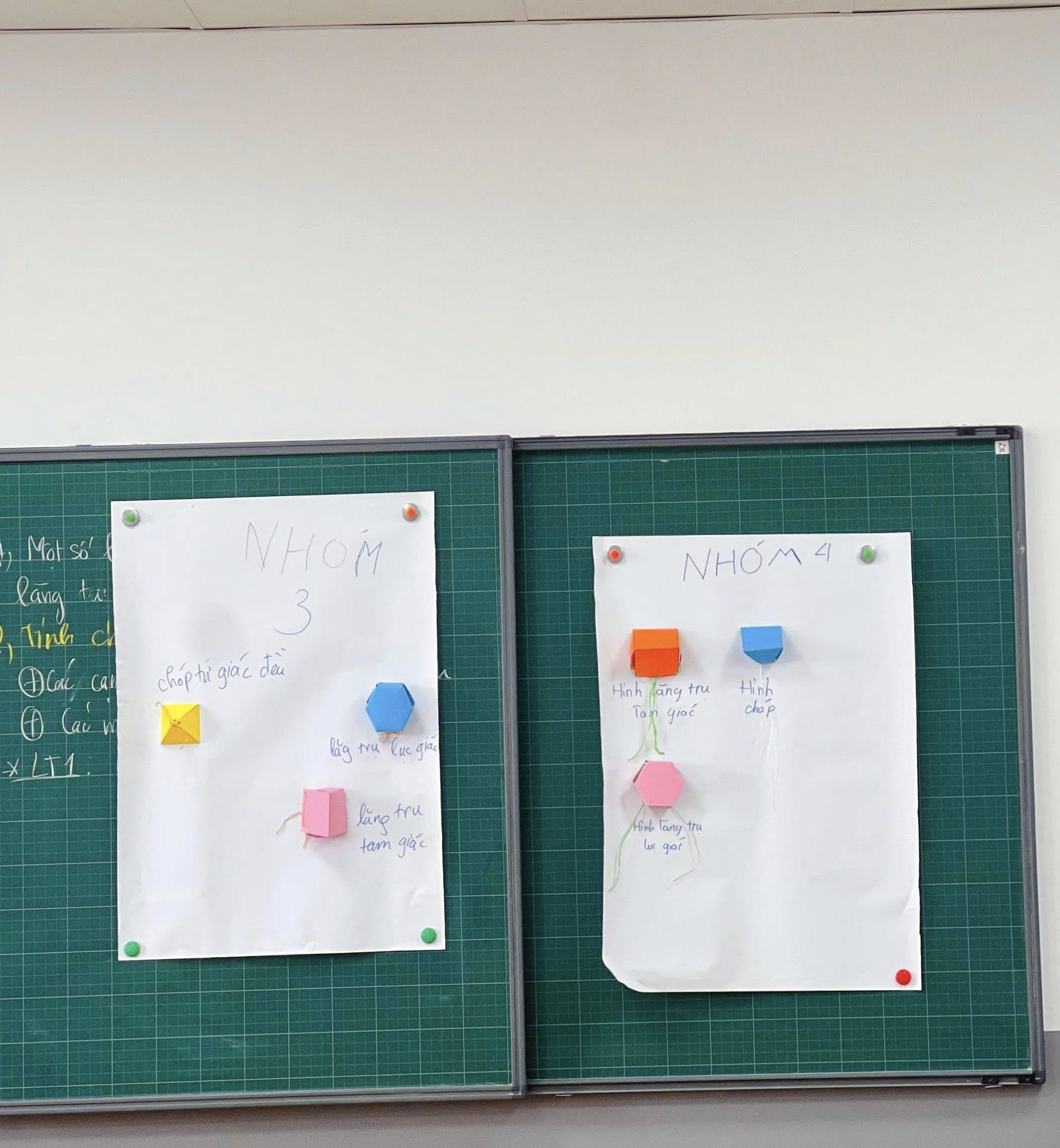 🎯Kết thúc tiết học là hoạt động thực hành vô cùng thú vị: các nhóm học sinh tự tay làm mô hình hình trụ, hình hộp bằng giấy bìa. Nhờ đó, kiến thức trở nên trực quan, dễ hiểu và được ghi nhớ sâu hơn.